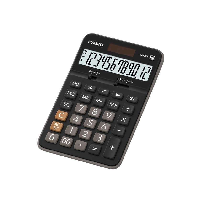 Casio AX-12B Masaüstü Hesap Makinesi12 hane Bağımsız hafızaBüyük toplamGeri silme tuşu% tuşuMU +/-Çift sıfır tuşuCut, up, 5/4 yuvarlama tuşlarıOndalık seçiciADD moduPilli ve güneş enerjili