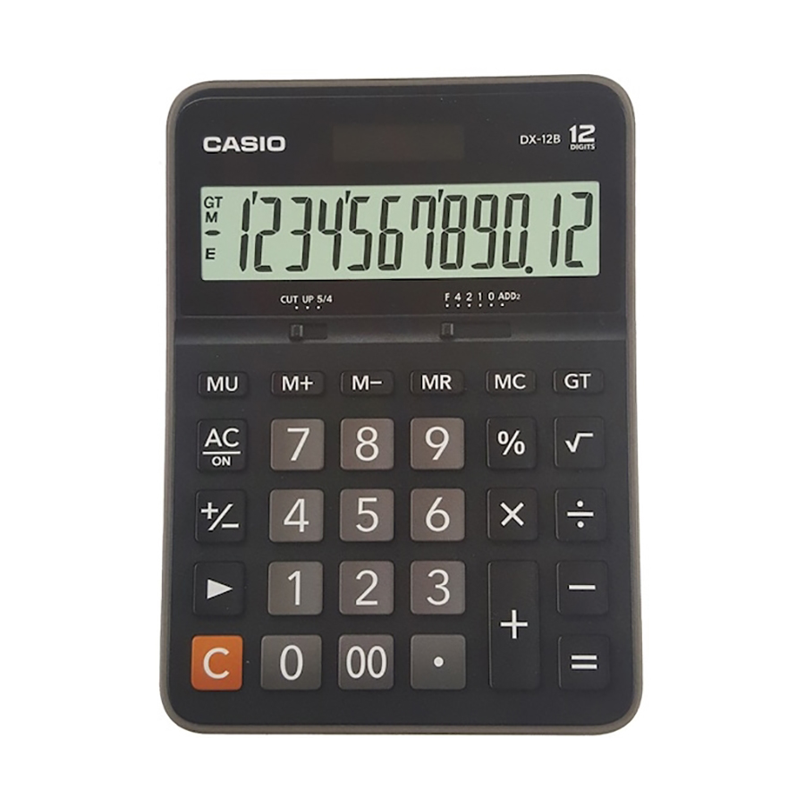 Casio DX-12B-BK Hesap Makinesi 12 Hane12 haneli olup kolay kullanım için tasarlandı ve üretildi.Işığın yeterli olduğu durumlarda güneş enerjisiyle, yeterli olmadığı durumlarda ise pil ile çalışma imkanı sağlar.Daha geniş ekran ile verileri okumanızı kolaylaştırır.Toplama makinesinin tüm zam hesaplama özelliklerine ek olarak kolaylaştırılmış maliyet ve kar hesaplamaları.
