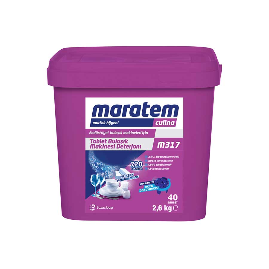 Maratem M317 Endüstriyel Bulaşık Makineleri için Tablet Bulaşık Deterjanı – 40 TabletAkıllı doz uyarıcısı sayesinde ilave bir ekipmana gerek kalmadan doğru ve etkin kullanım sağlar.Sert su koşullarında bile bulaşıkları mükemmel temizler.Porselen üzerindeki sır tabakasına ve cam yüzeylere zarar vermez, metalleri karartmaz, alüminyuma uygundur.Çay, kahve ve nişasta lekelerini çıkarır, istenmeyen kokuları giderir.Pürüzlü yüzeylerde ve girintili mutfak eşyalarında özellikle etkilidir.Bardaklarda su lekesi bırakmadan parlaklık sağlar.