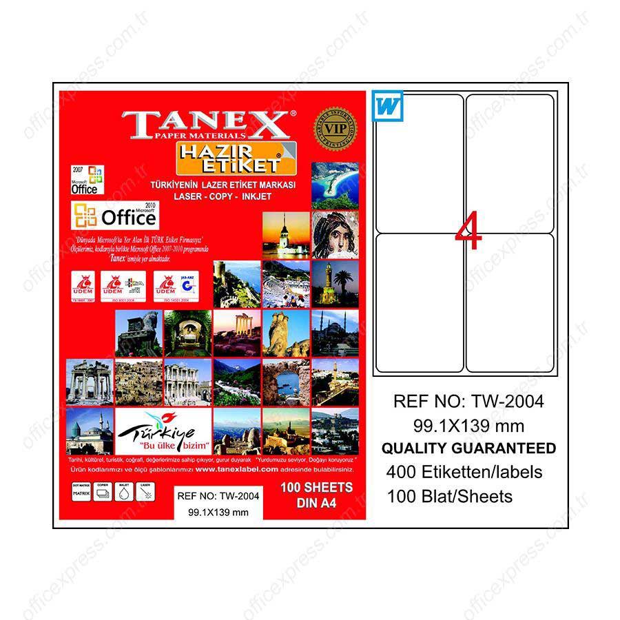 Tanex TW-2004 Beyaz Etiket 99.1 x 139 mmBeyaz lazer etiket99.1 x 139 mm ebatındaToplamda 4×100 etiketEtiket ölçü şablonu Office 2007/2010 programında yer almaktadır.