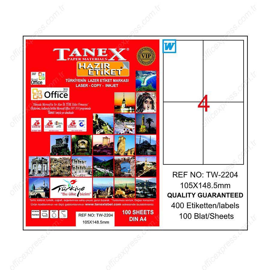 Tanex TW-2204 Beyaz Etiket 105 x 148.5 mmBeyaz lazer etiket105 x 148.5 mm ebatındaToplamda 4×100 etiketEtiket ölçü şablonu Office 2007/2010 programında yer almaktadır.