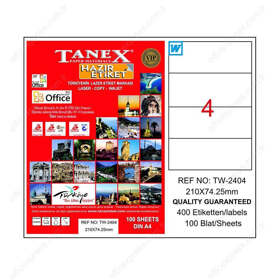 Tanex TW-2404 Beyaz Etiket 210 x 74.25 mmBeyaz lazer etiket210 x 74.25 mm ebatındaToplamda 4×100 etiketEtiket ölçü şablonu Office 2007/2010 programında yer almaktadır.