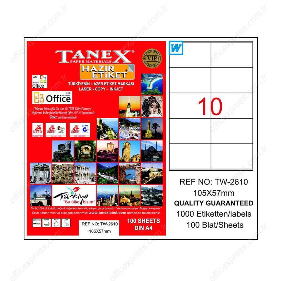 Tanex TW-2610 Beyaz Etiket 105 x 57 mmBeyaz lazer etiket105 x 57 mm ebatındaToplamda 10×100 etiketEtiket ölçü şablonu Office 2007/2010 programında yer almaktadır.