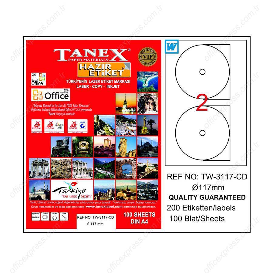 Tanex TW-3117 CD Etiketi 117 mmBeyaz lazer etiket117 mm ebatındaToplamda 2×100 etiketEtiket ölçü şablonu Office 2007/2010 programında yer almaktadır.